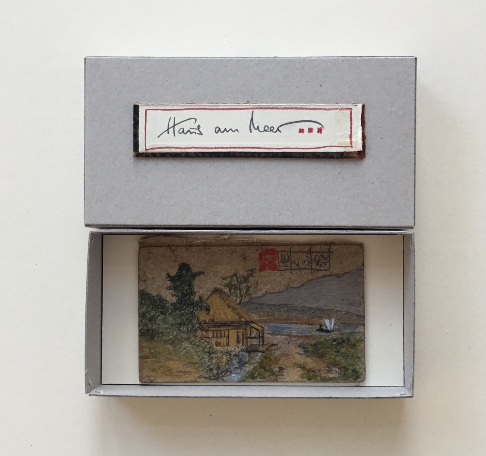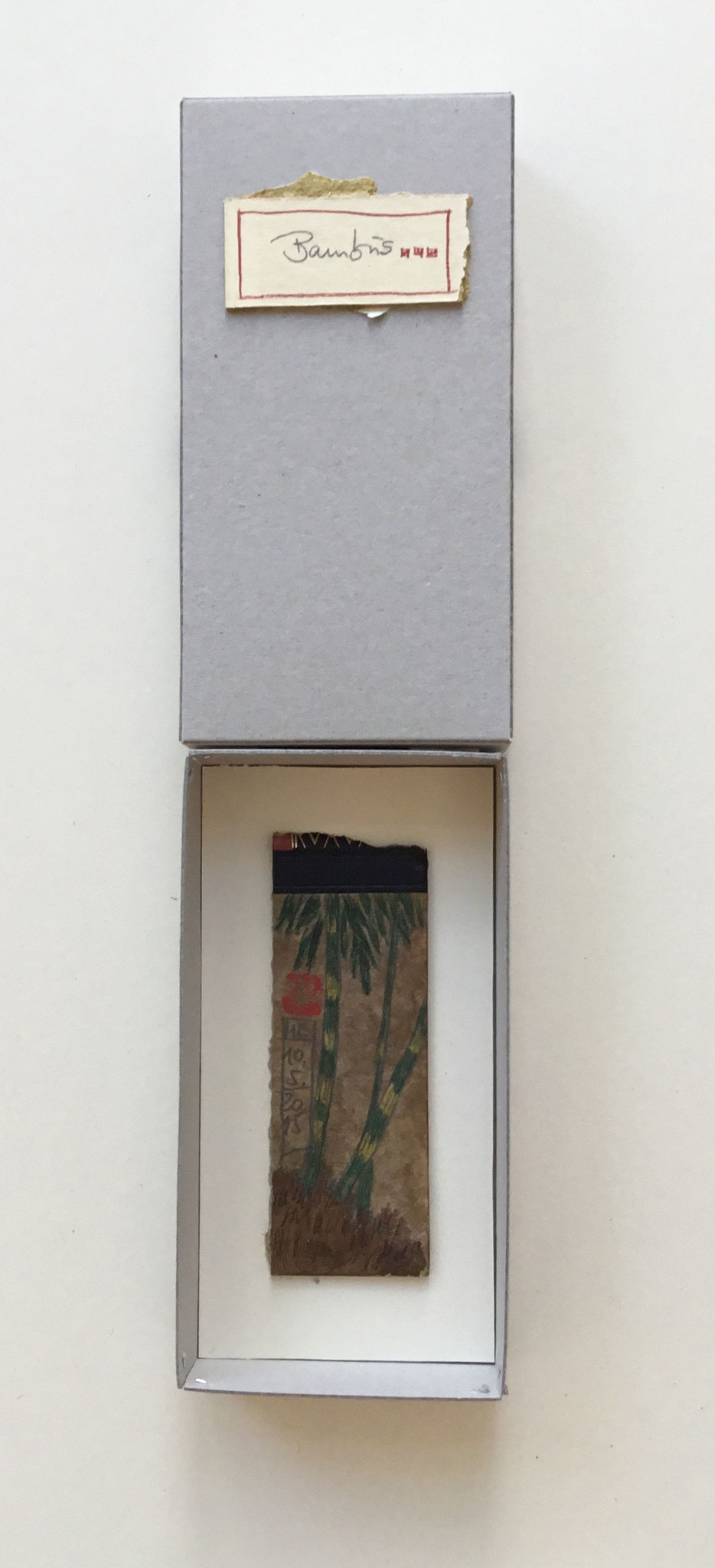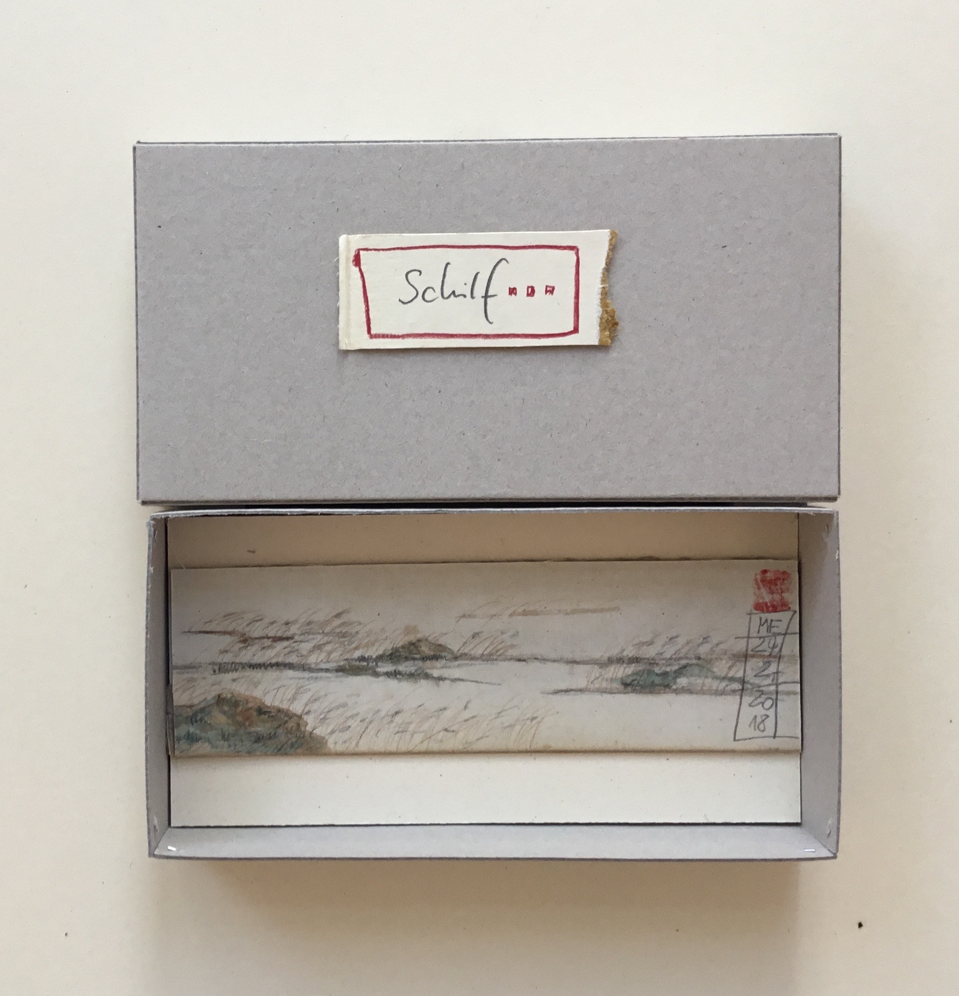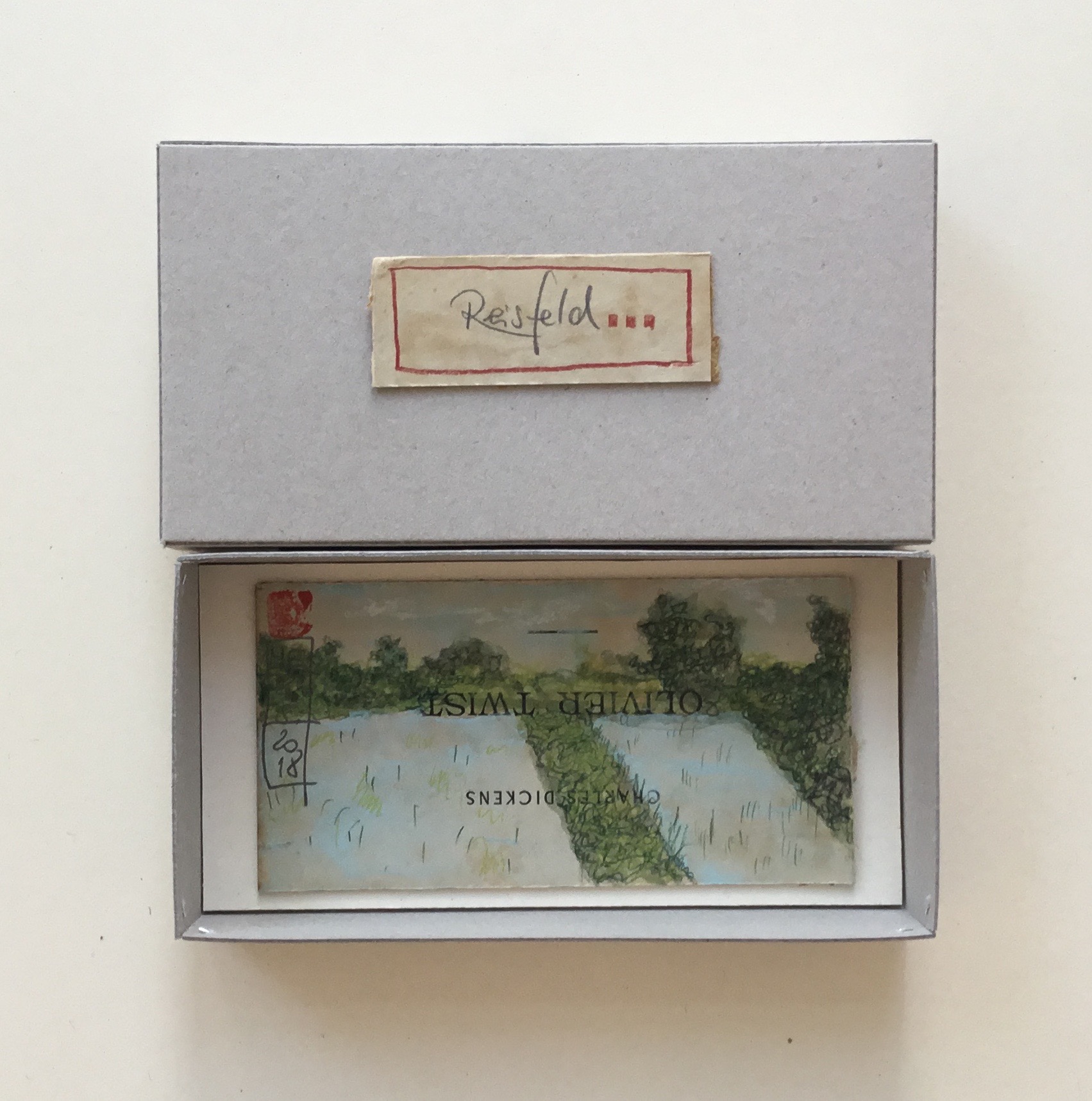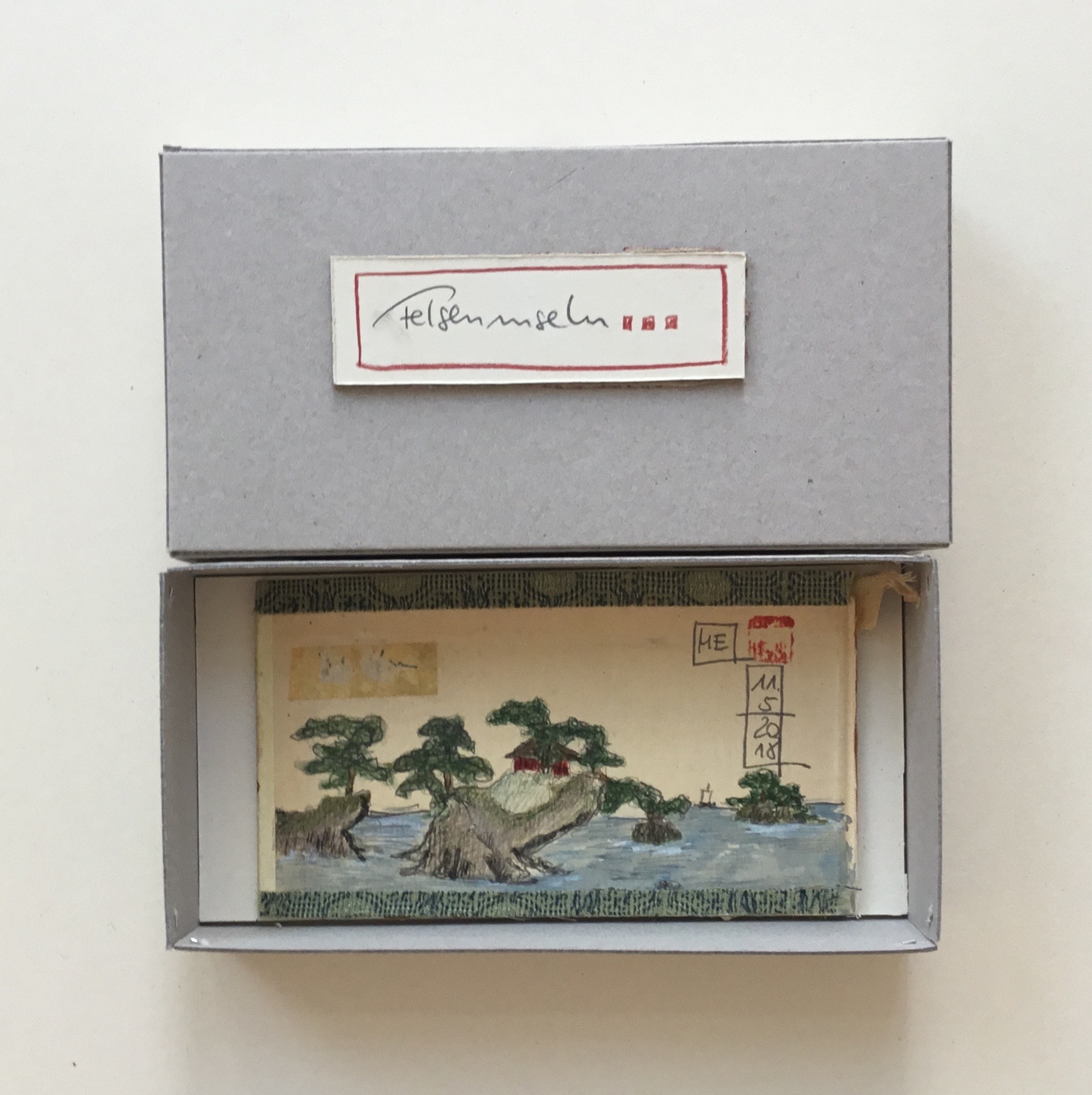 OBJEKTE/KUNSTWERKSTÜCKE, ZEICHNUNGEN AUF ALTEM BUCHDECKEL, 9 X 18 CM, 2017, © MARTINA ETIENNE