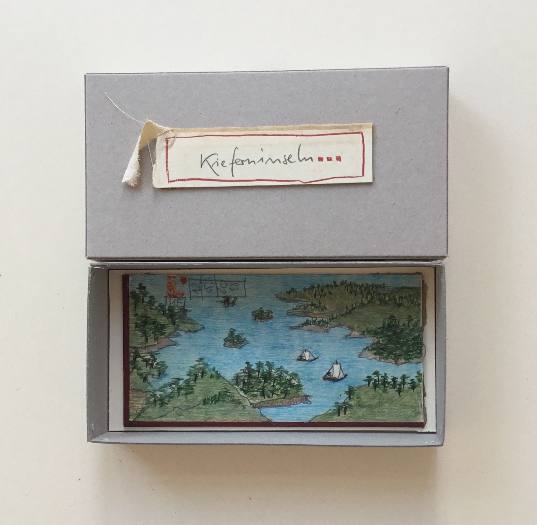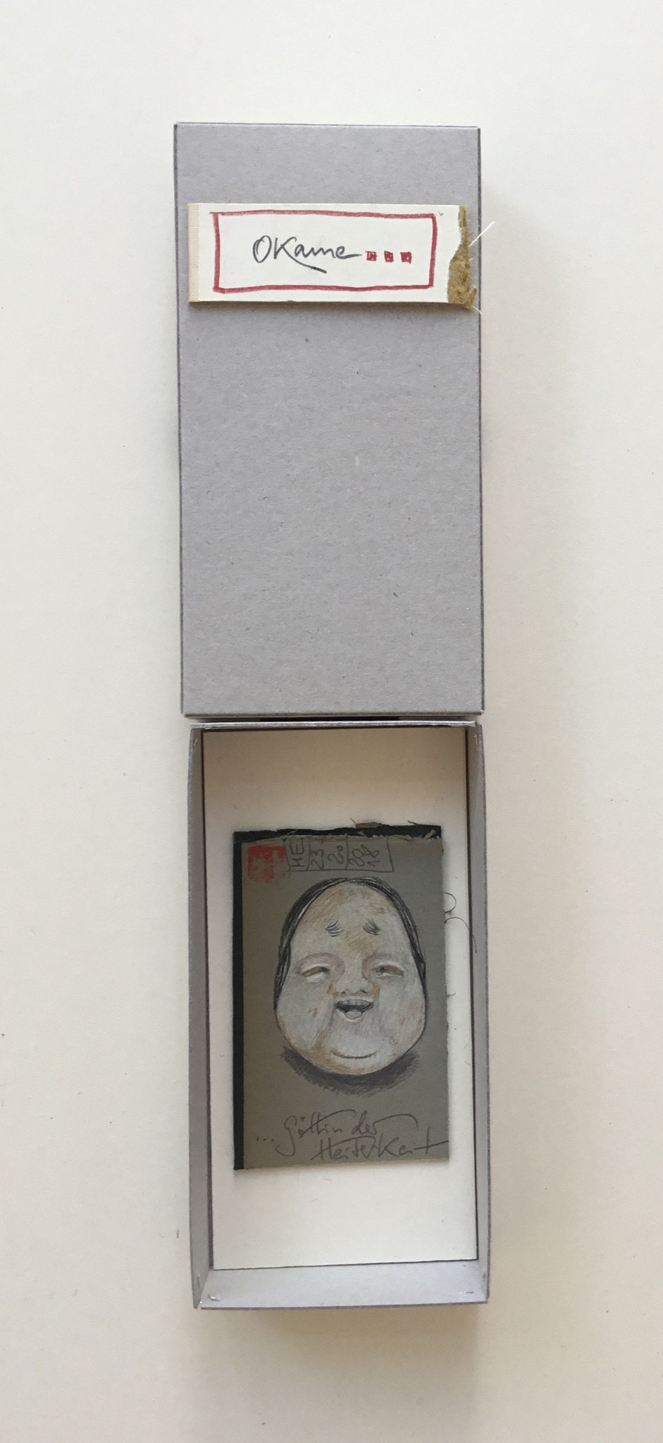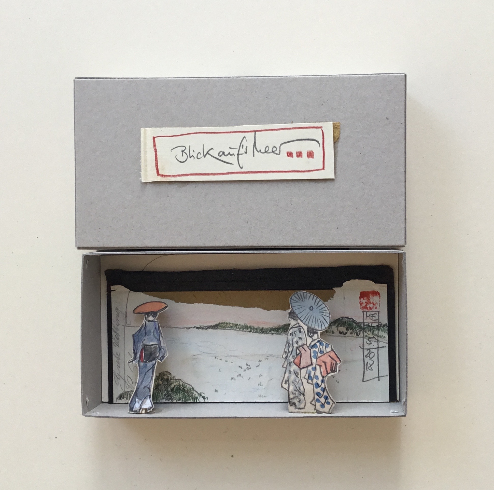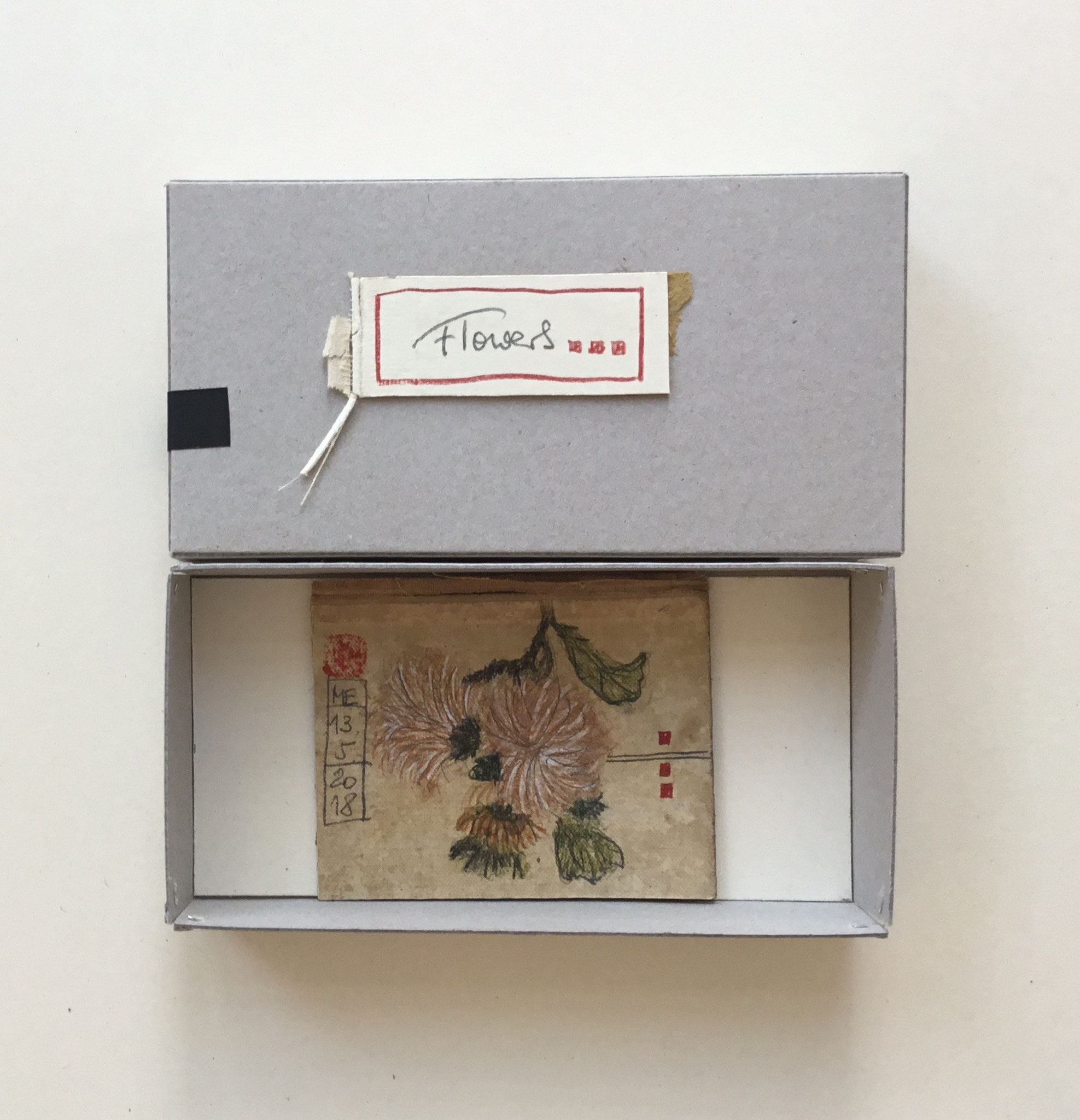 OBJEKTE/KUNSTWERKSTÜCKE, ZEICHNUNGEN AUF ALTEM BUCHDECKEL, 9 X 18 CM, 2017, © MARTINA ETIENNE