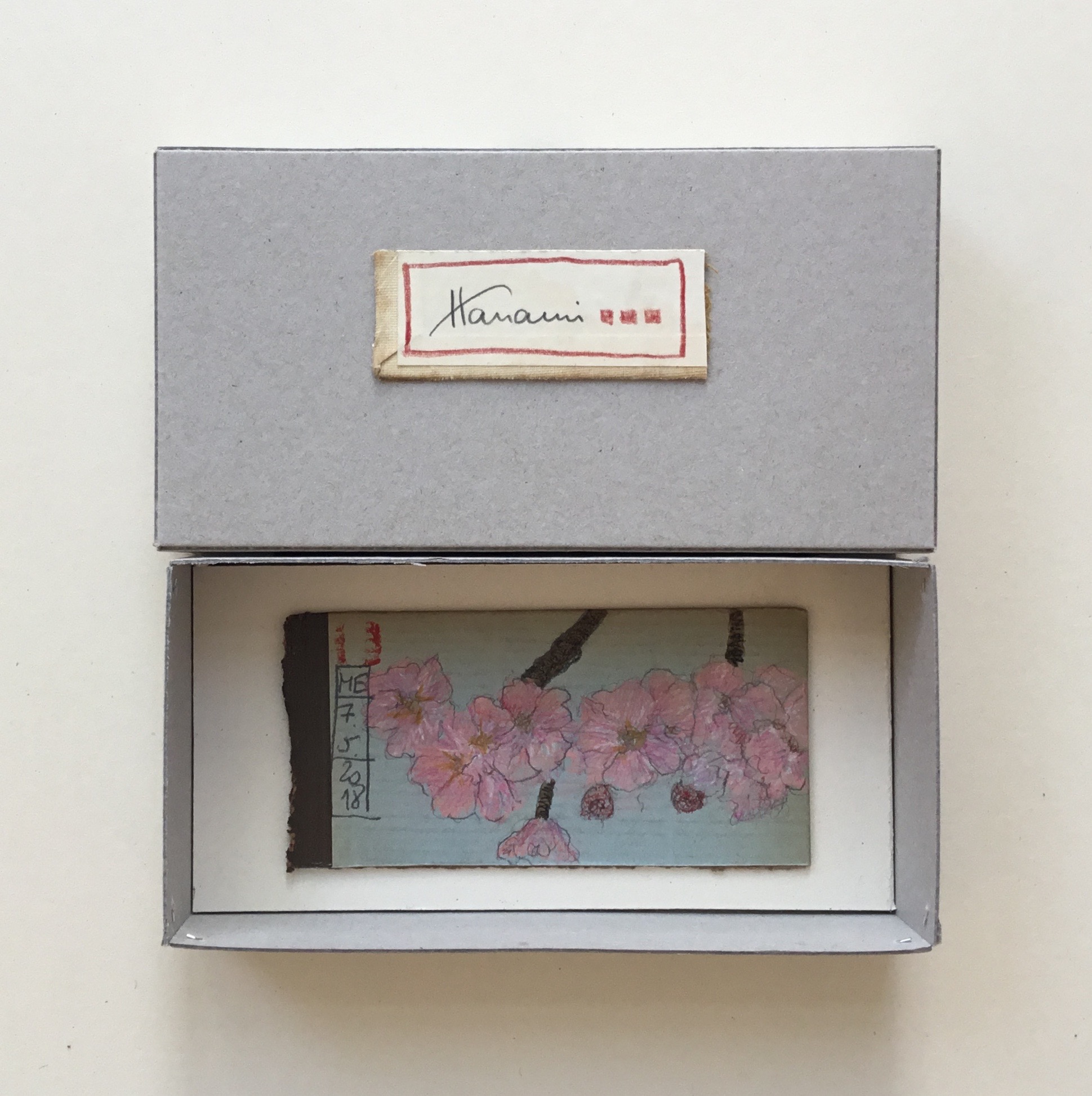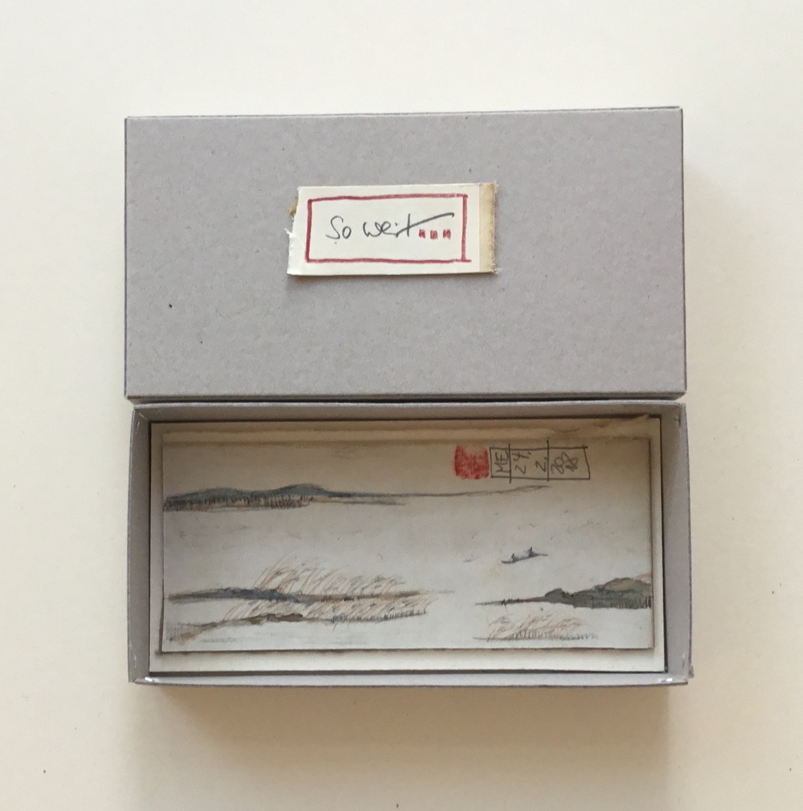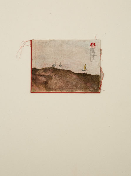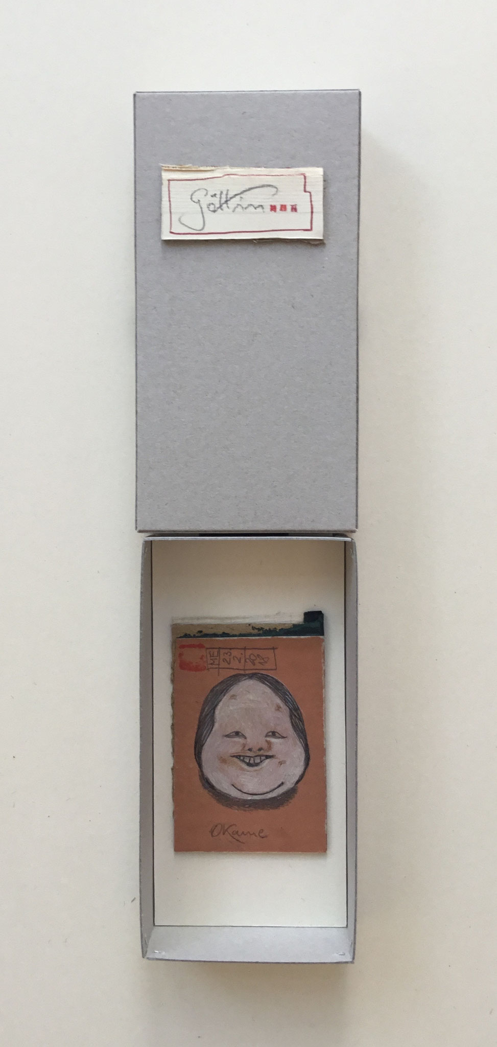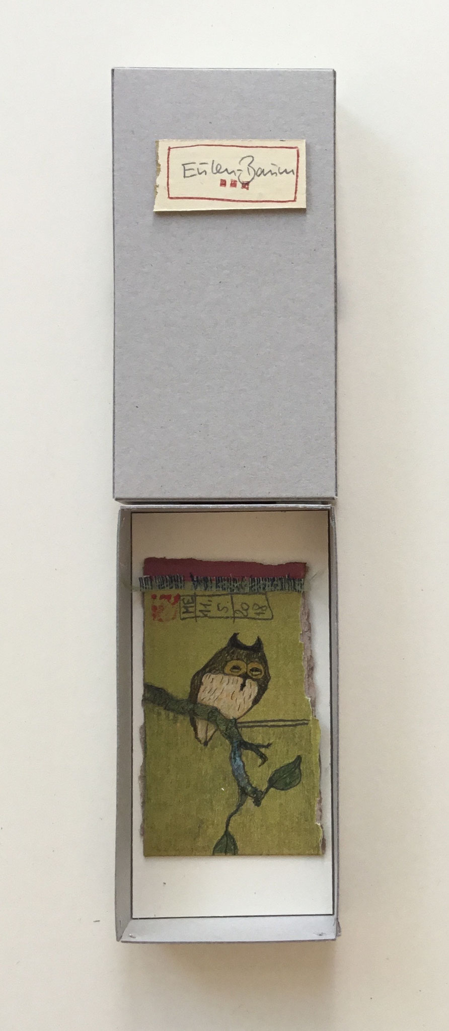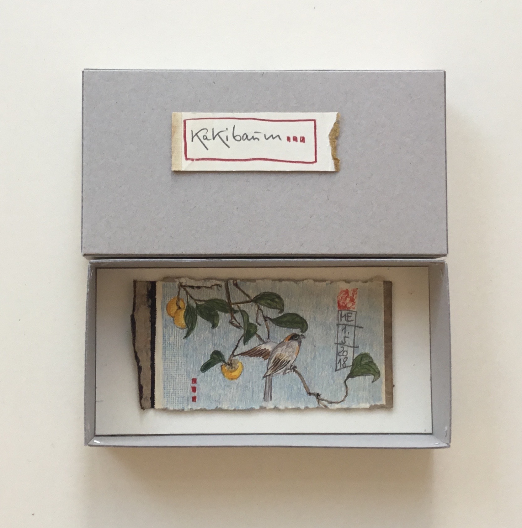 OBJEKTE/KUNSTWERKSTÜCKE, ZEICHNUNGEN AUF ALTEM BUCHDECKEL, 9 X 18 CM, 2017, © MARTINA ETIENNE