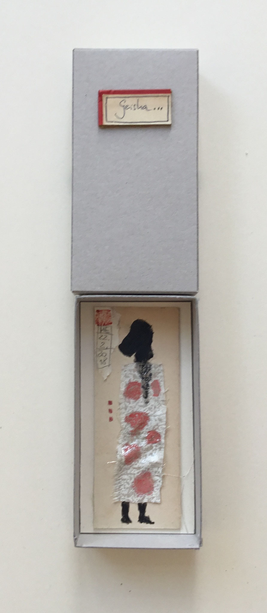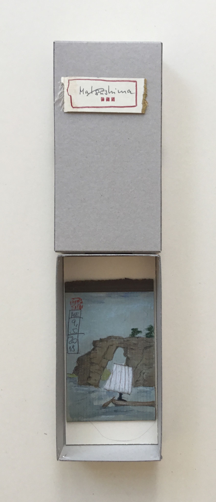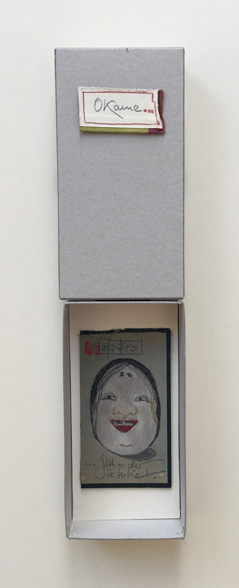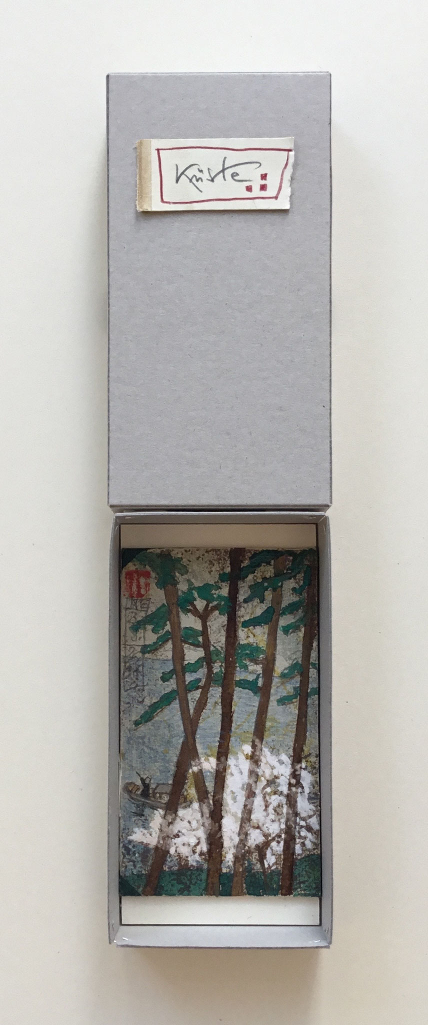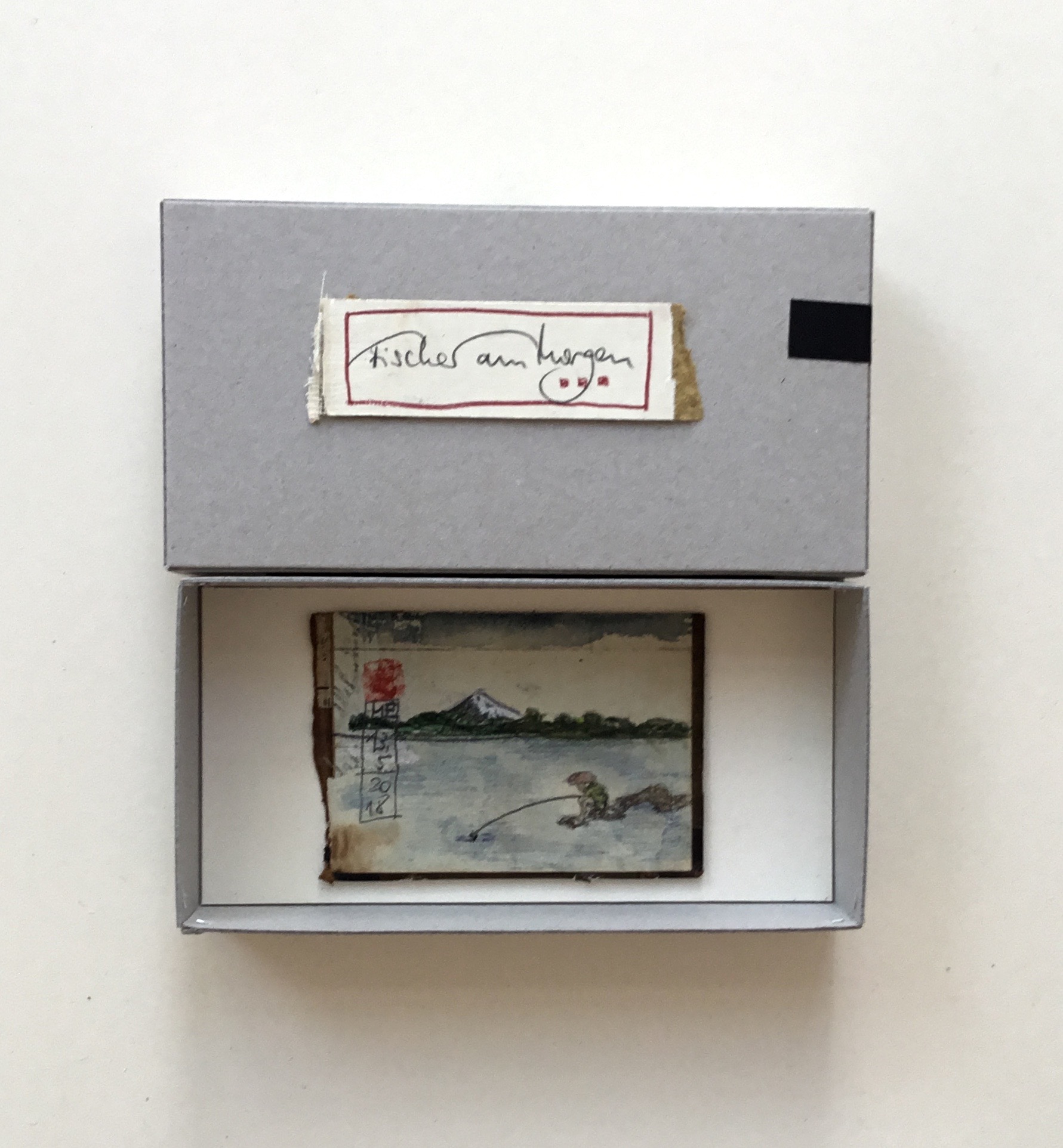 OBJEKTE/KUNSTWERKSTÜCKE, ZEICHNUNGEN AUF ALTEM BUCHDECKEL, 9 X 18 CM, 2017, © MARTINA ETIENNE