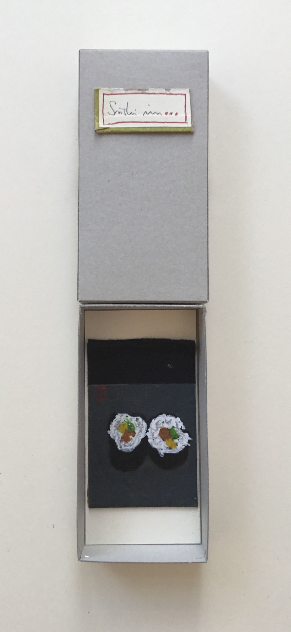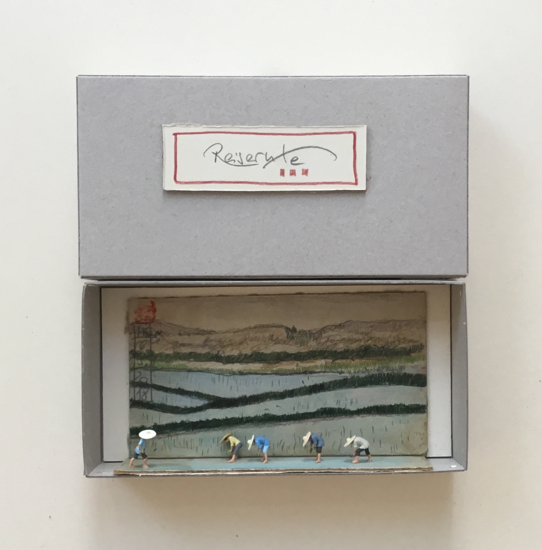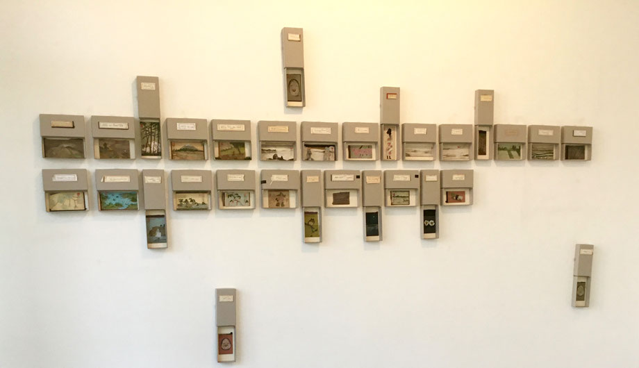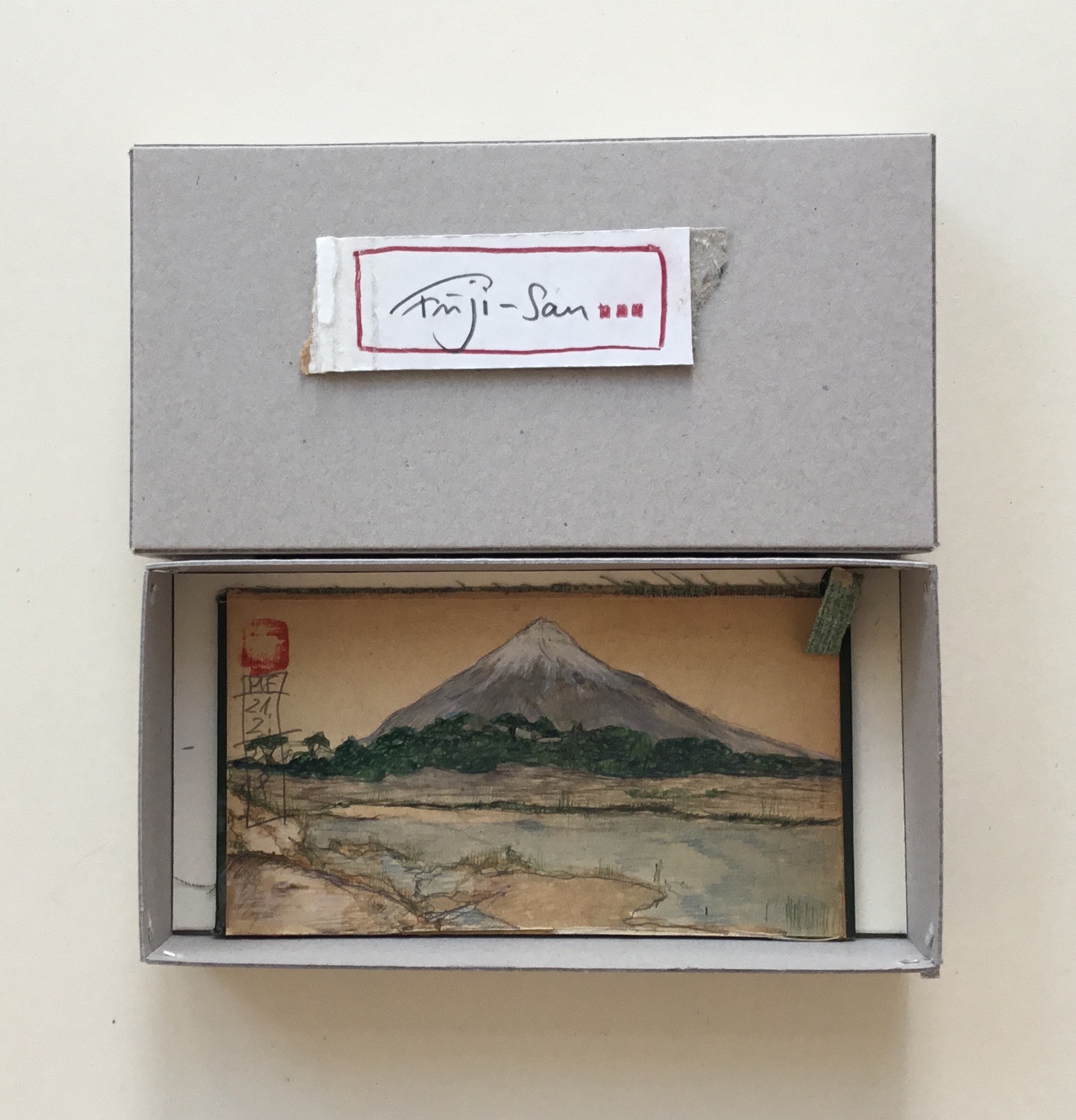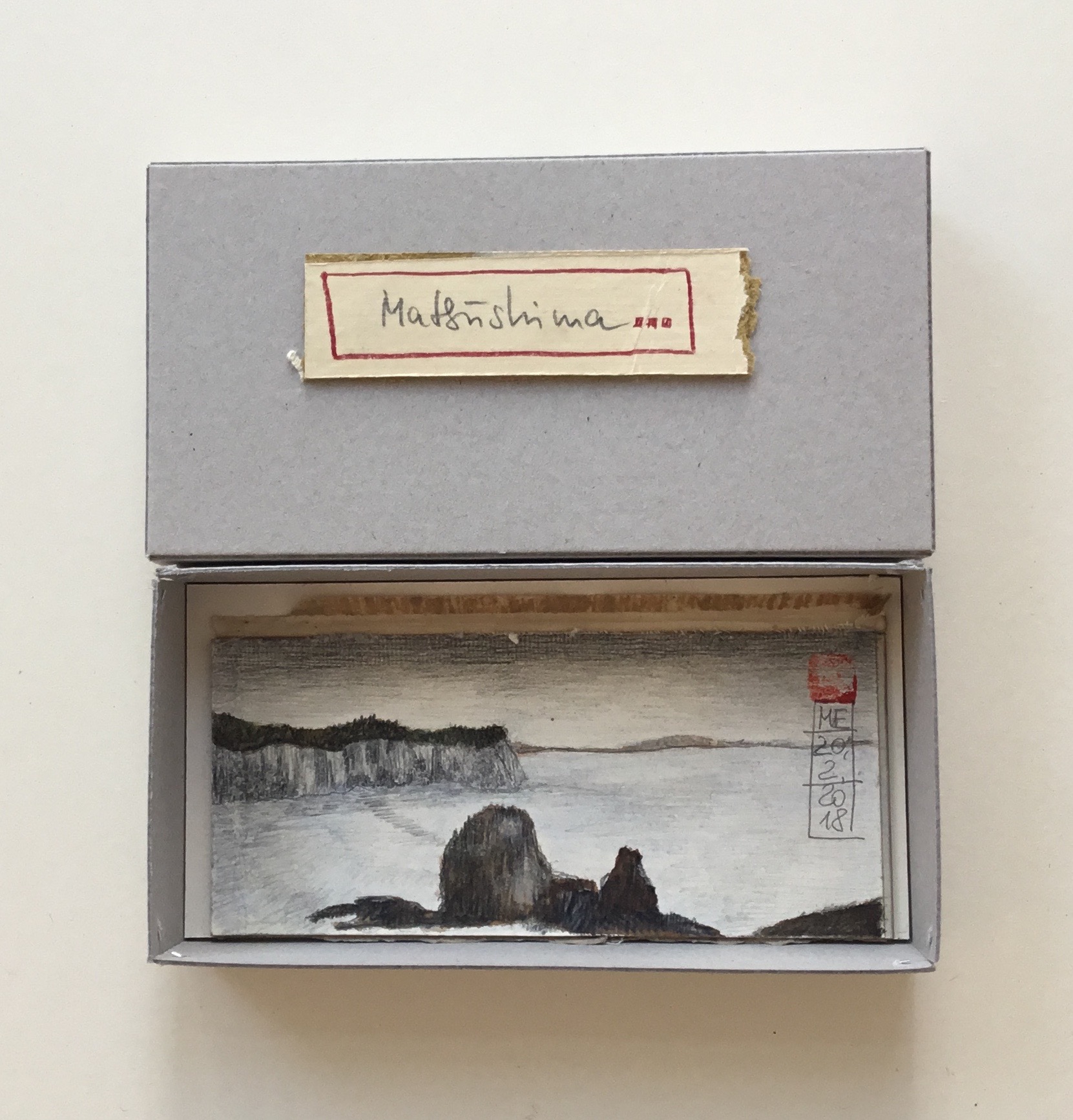 OBJEKTE/KUNSTWERKSTÜCKE, ZEICHNUNGEN AUF ALTEM BUCHDECKEL, 9 X 18 CM, 2017, © MARTINA ETIENNE