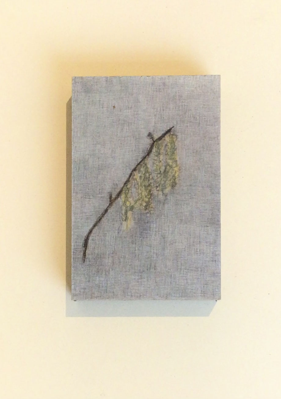 MINIATUR "REGEN...", ZEICHNUNG/OBJEKT/KUNSTWERKSTÜCK, BLEISTIFT/FARBSTIFT AUF MDF 10 X 15 CM, 2025 © MARTINA ETIENNE