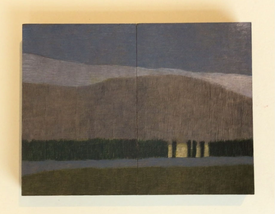 MINIATUR "LANDSCHAFT V", ZEICHNUNG/OBJEKT/KUNSTWERKSTÜCK, BLEISTIFT/FARBSTIFT AUF MDF 10 X 15 CM, 2025 © MARTINA ETIENNE