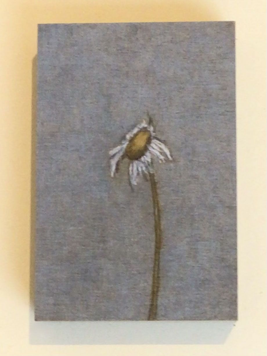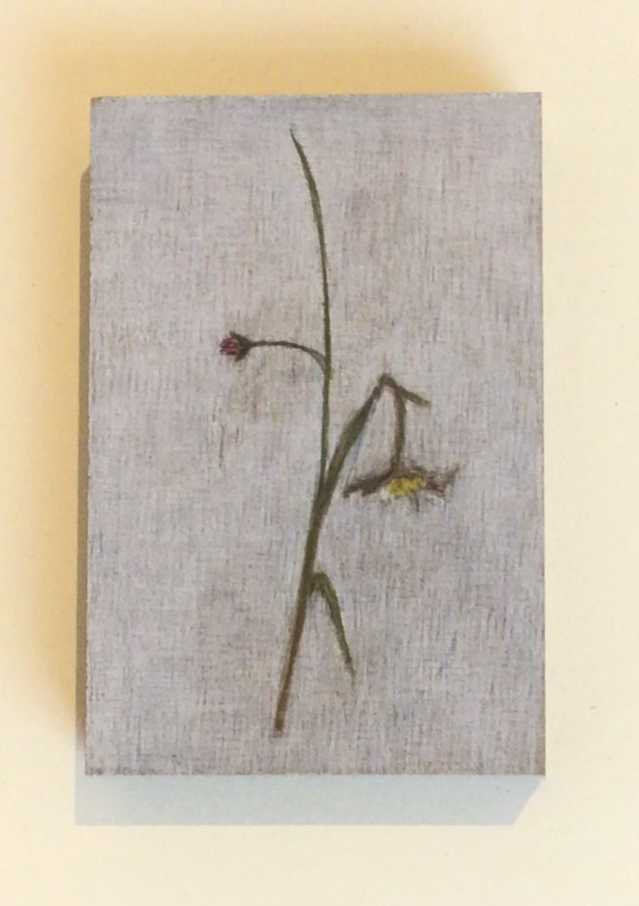 MINIATUR "MARGERITE I, ZEICHNUNG/OBJEKT/KUNSTWERKSTÜCK, BLEISTIFT/FARBSTIFT AUF MDF 10 X 10 CM, 2025 © MARTINA ETIENNE