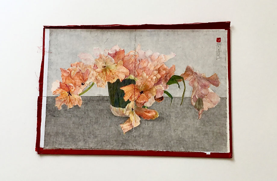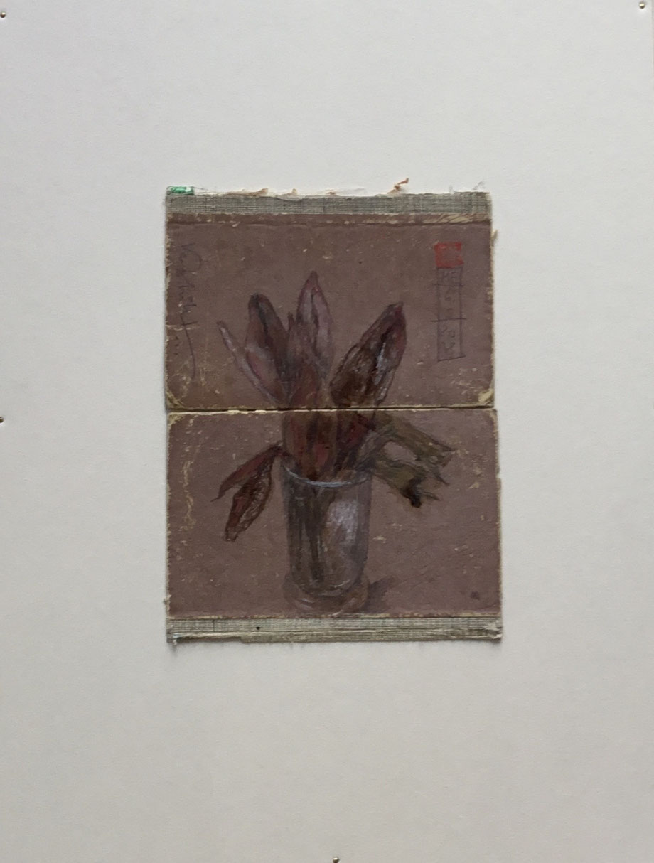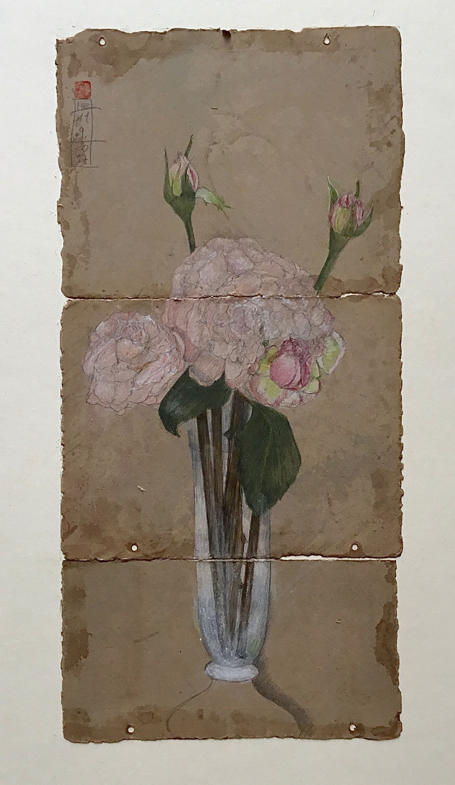 ZEICHNUNG BLEISTIFT/FARBSTIFT AUF ALTEM BUCHDECKEL, AUFGEZOGEN AUF FINNISCHE HOLZPAPPE, 70 X 50 CM, 2017, © MARTINA ETIENNE