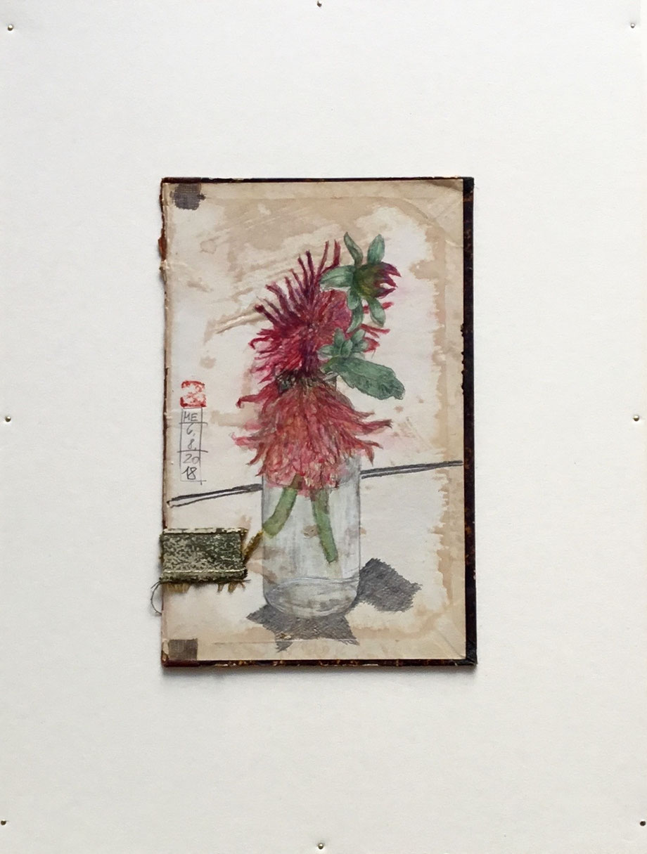 ZEICHNUNG BLEISTIFT/FARBSTIFT AUF ALTEM BUCHDECKEL, AUGEZOGEN AUF FINNISCHE HOLZPAPPE, 30 X 40 CM, 2018 © MARTINA ETIENNE