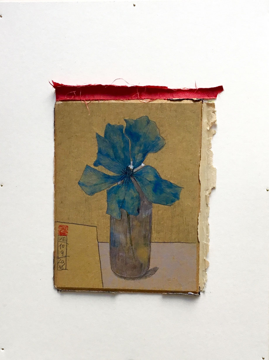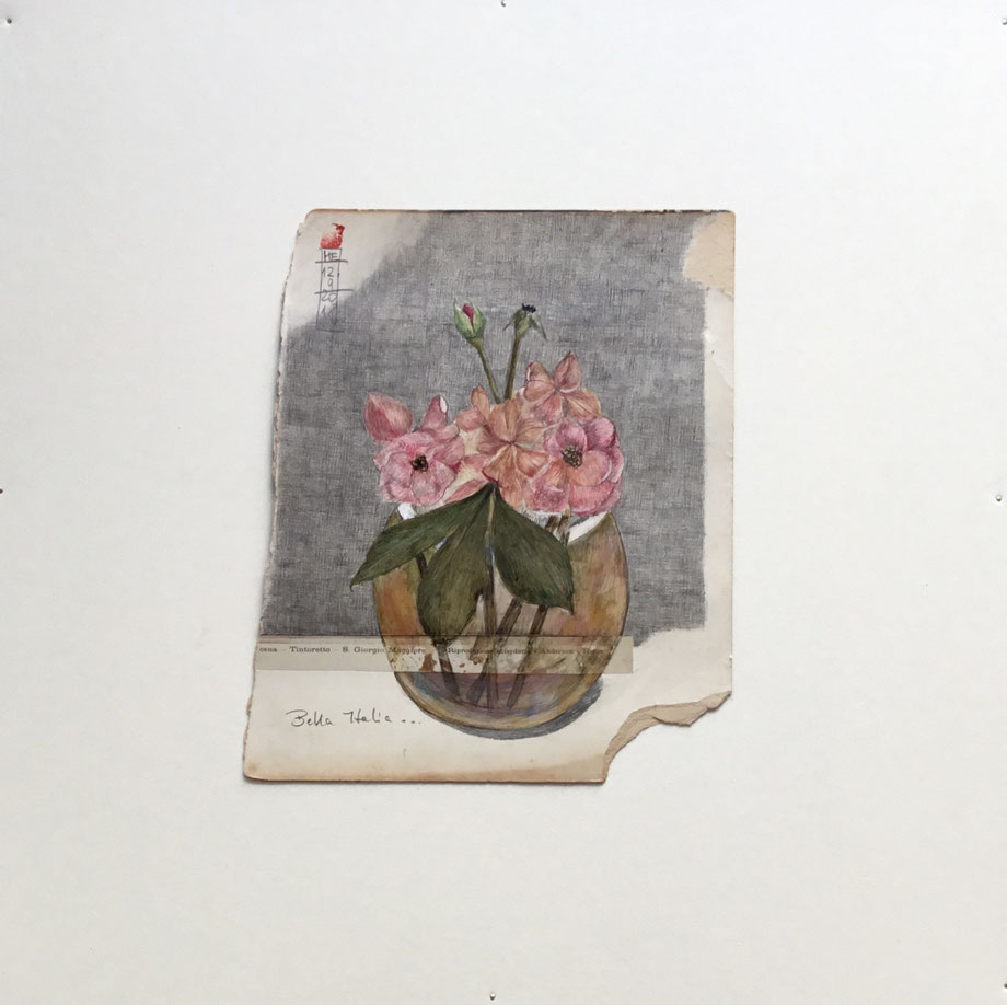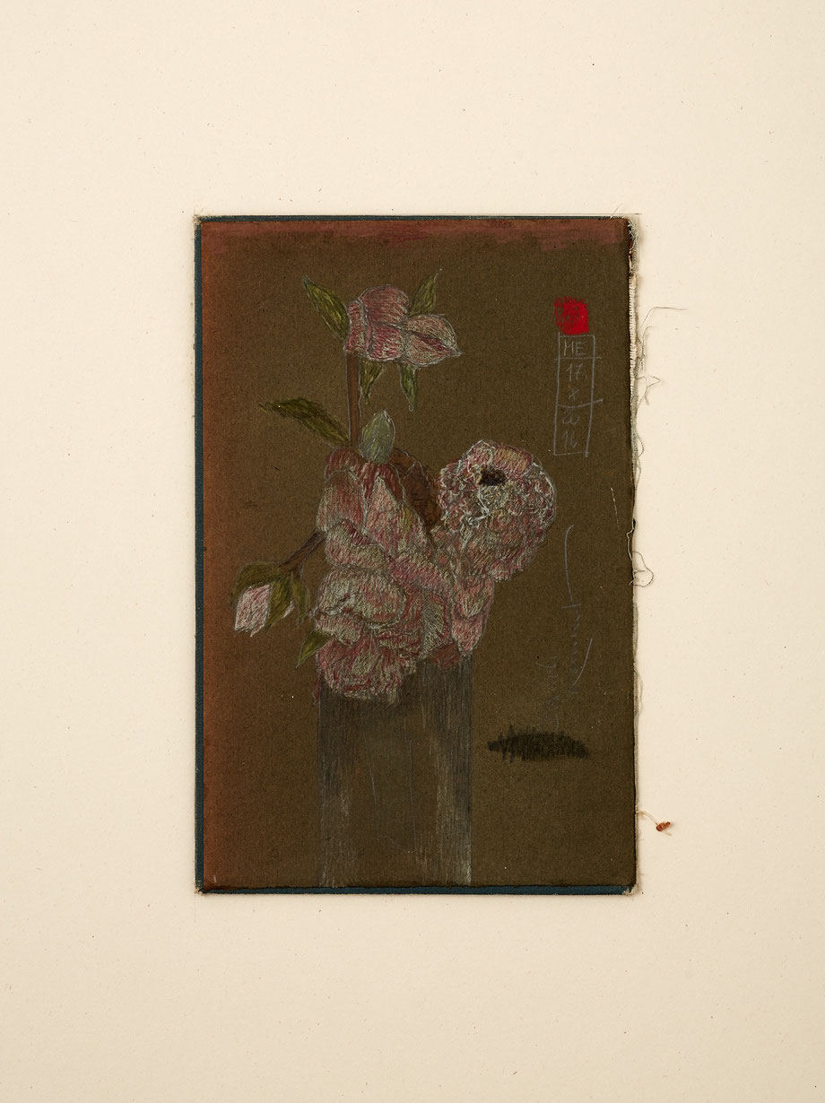 ZEICHNUNG BLEISTIFT/FARBSTIFT AUF ALTEM BUCHDECKEL, AUGEZOGEN AUF FINNISCHE HOLZPAPPE, 40 X 30 CM, 2018 © MARTINA ETIENNE