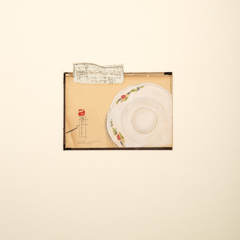 ZEICHNUNG BLEISTIFT/FARBSTIFT AUF ALTEM BUCHDECKEL, AUGEZOGEN AUF FINNISCHE HOLZPAPPE, 50 X 50 CM,, 2017 © MARTINA ETIENNE