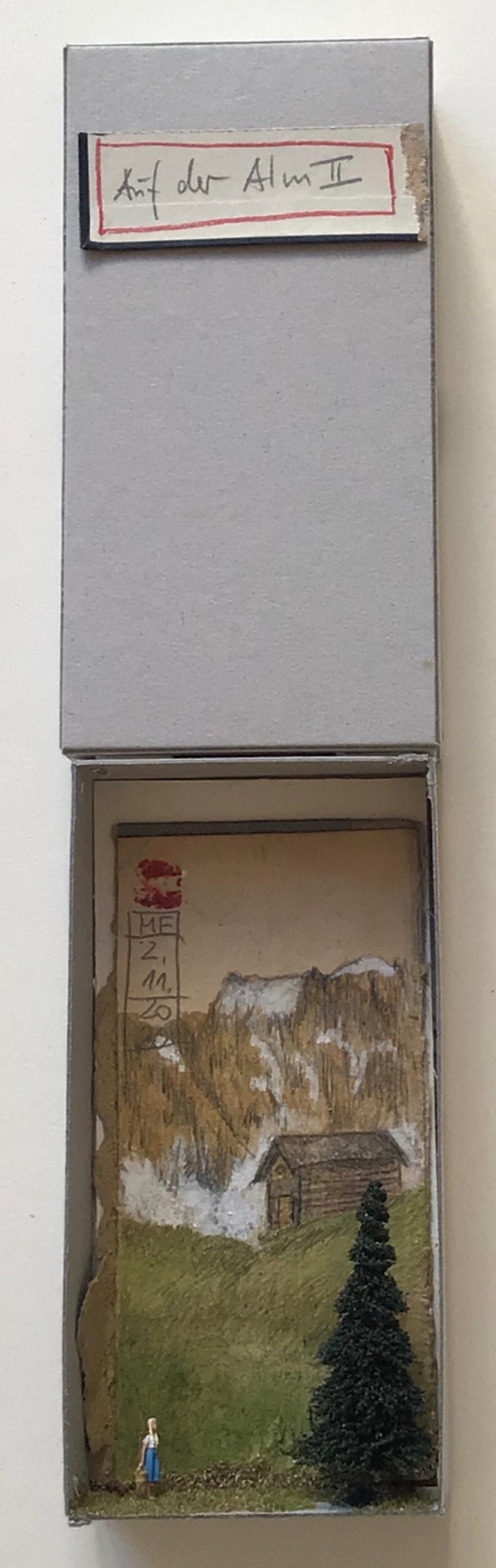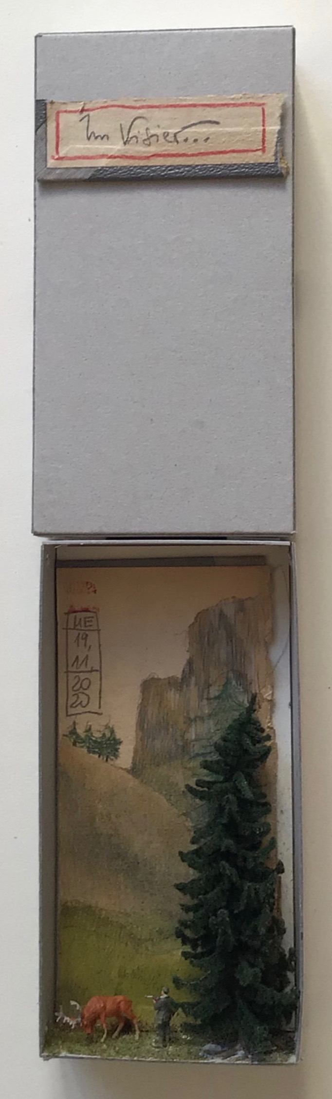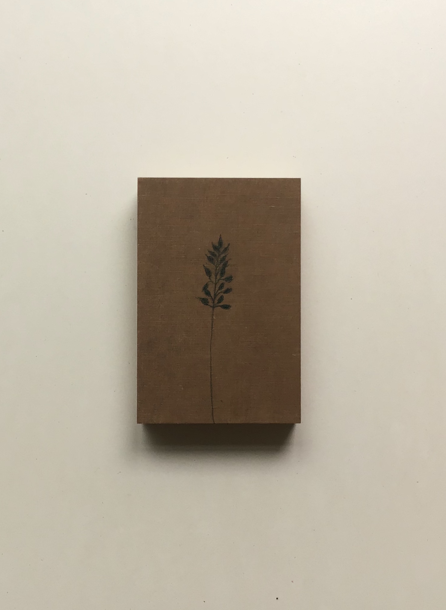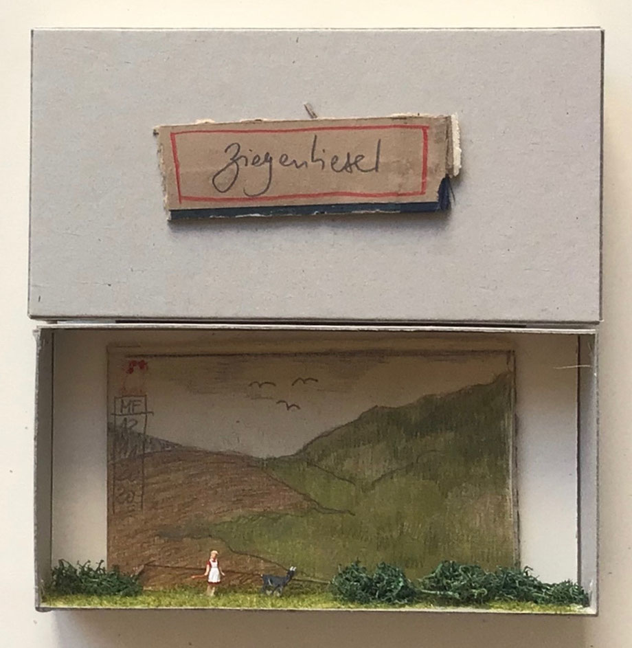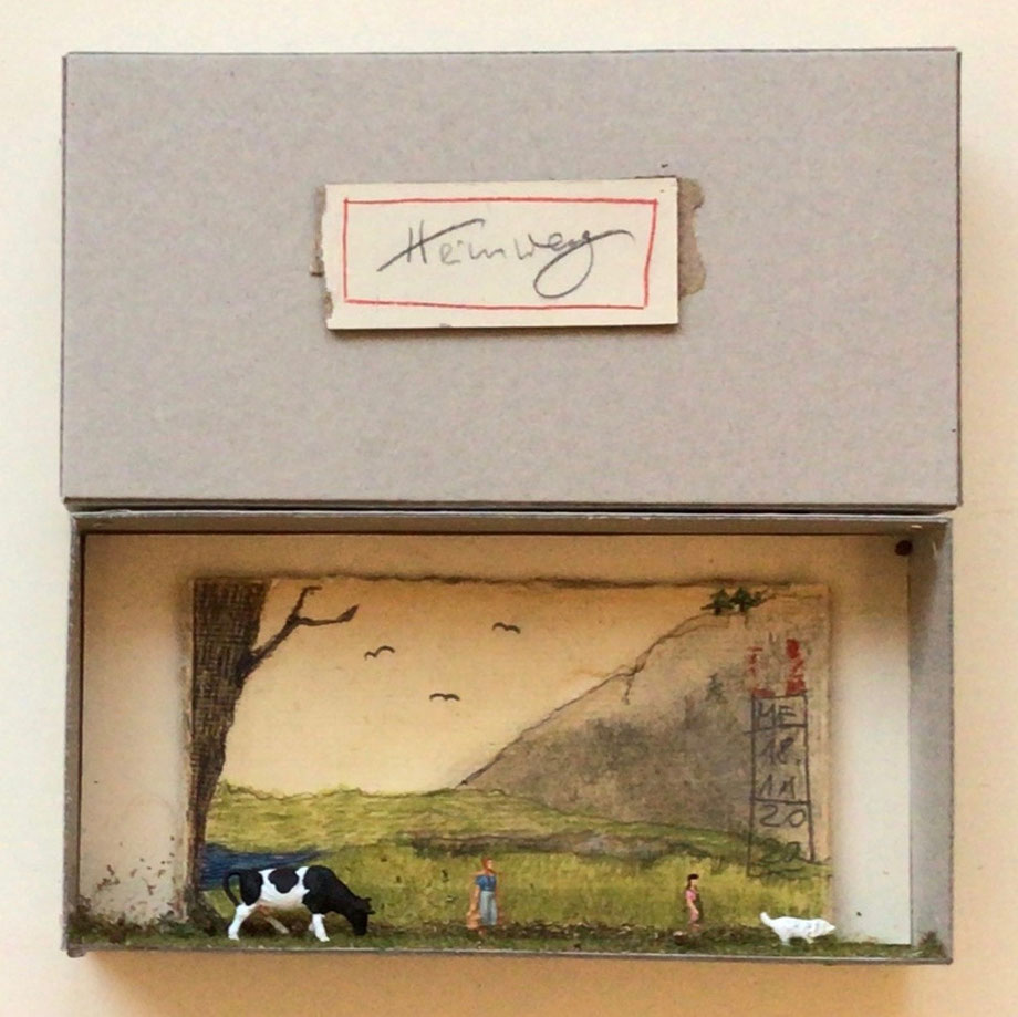 ZEICHNUNG/OBJEKT/KUNSTWERKSTÜCK, BLEISTIFT/FARBSTIFT AUF ALTEM BUCHDECKEL, 9 X 18 CM,, 2020, © MARTINA ETIENNE