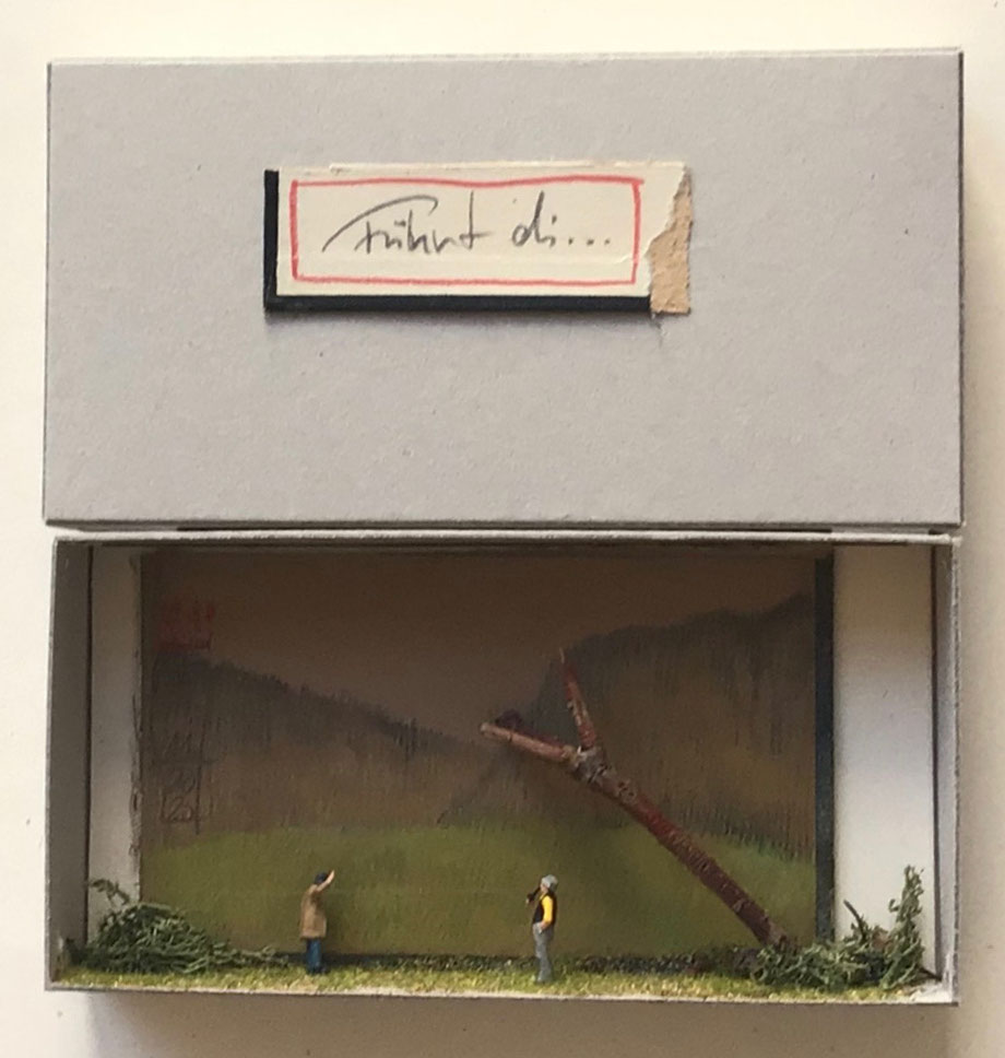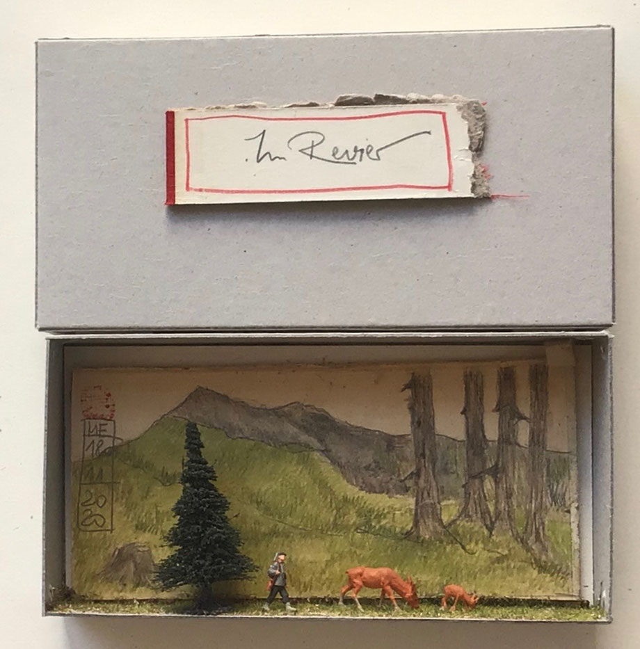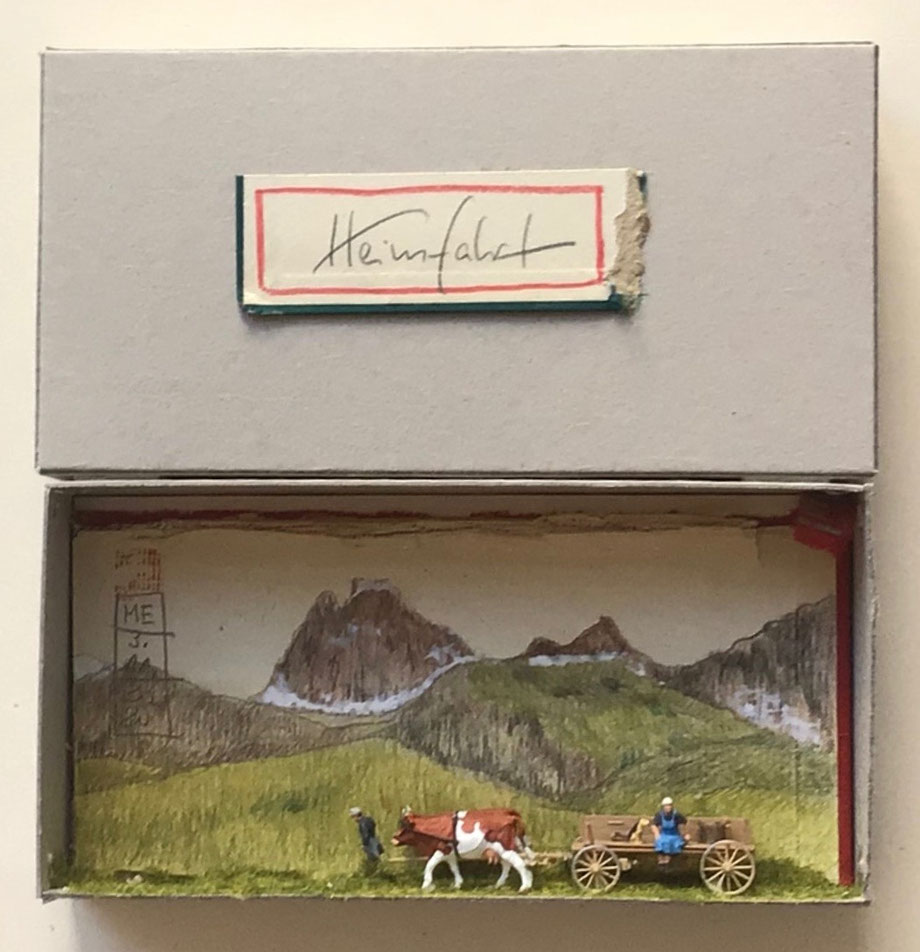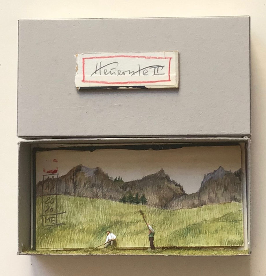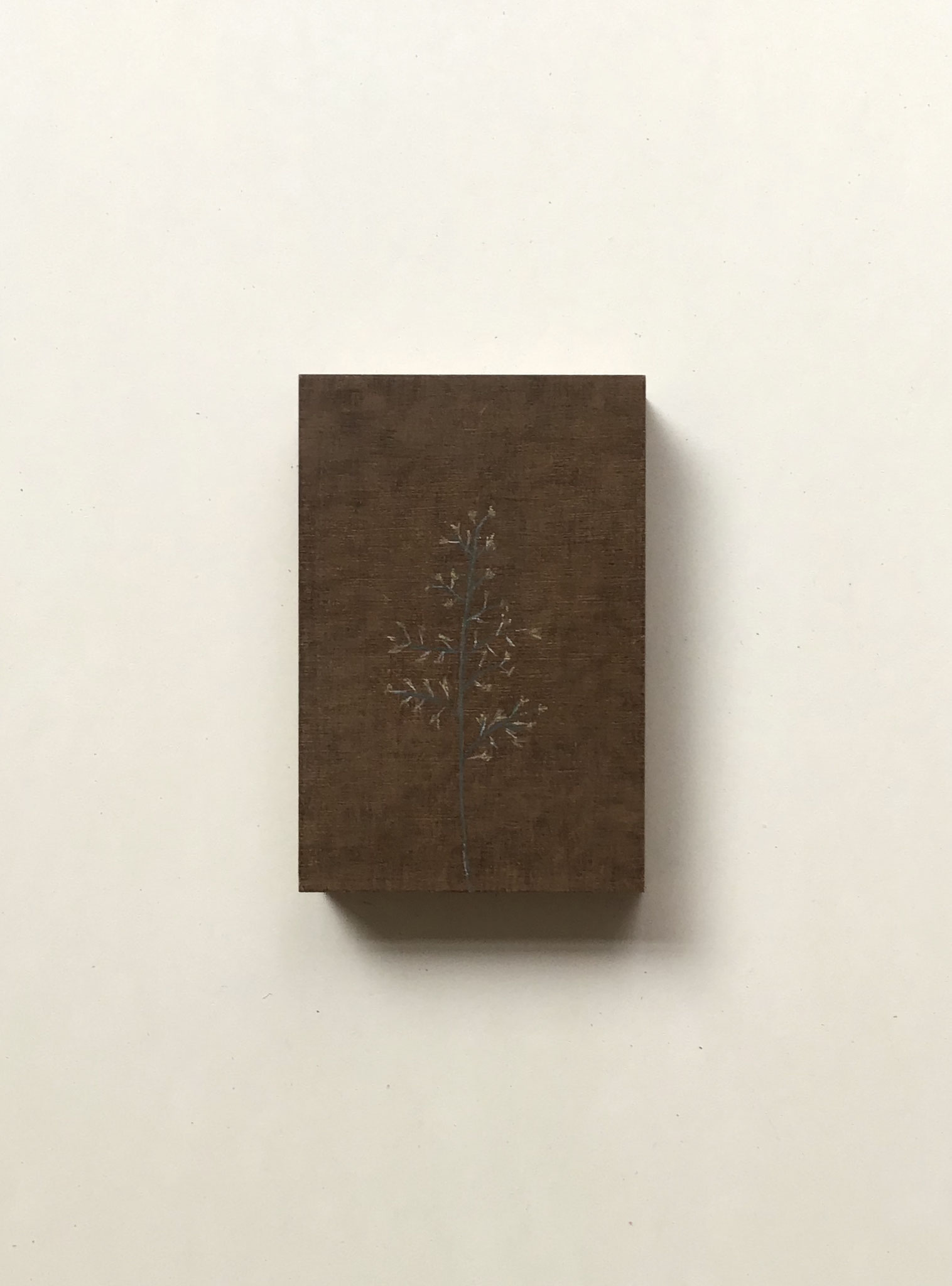 ZEICHNUNG/OBJEKT/KUNSTWERKSTÜCK, BLEISTIFT/FARBSTIFT AUF ALTEM BUCHDECKEL, 9 X 18 CM,, 2020, © MARTINA ETIENNE