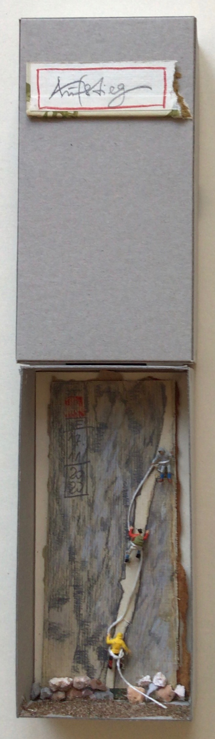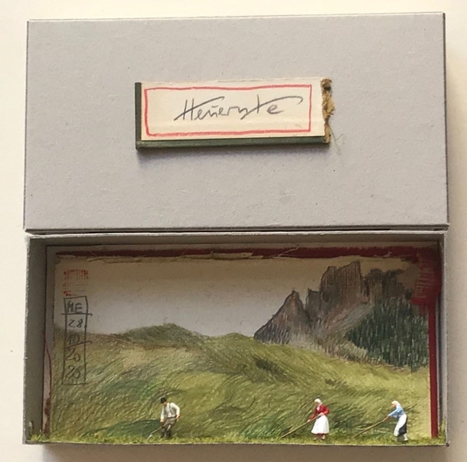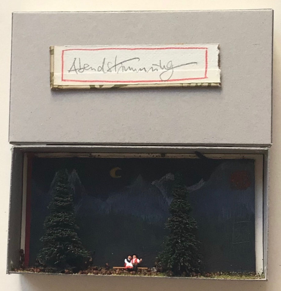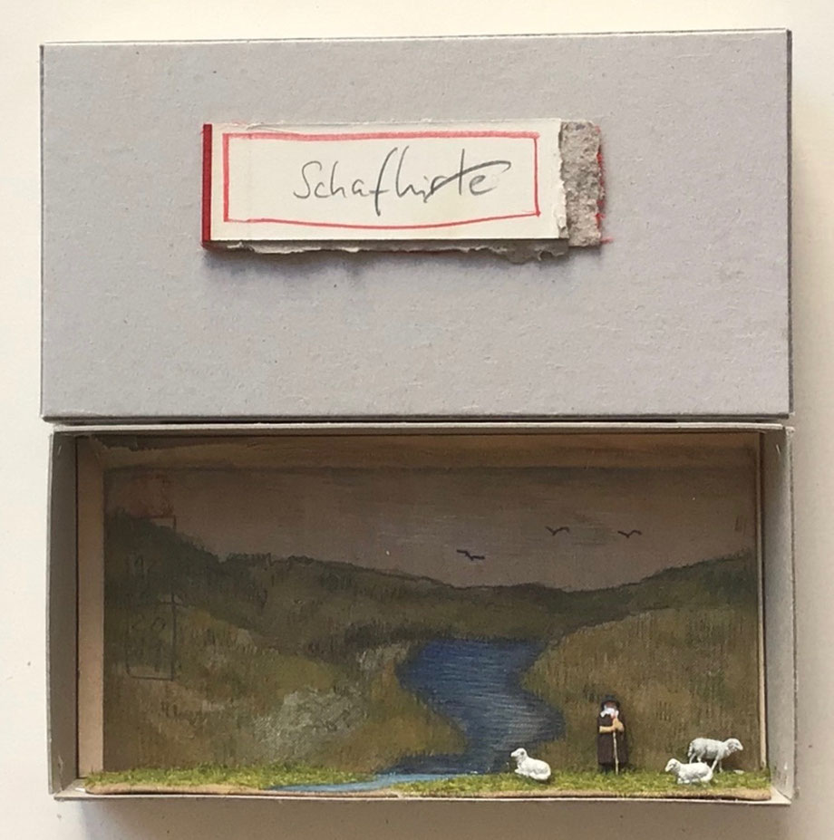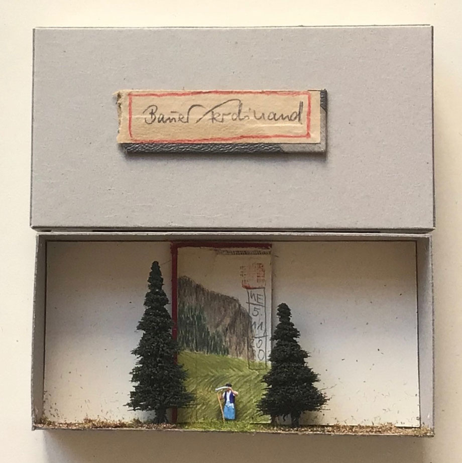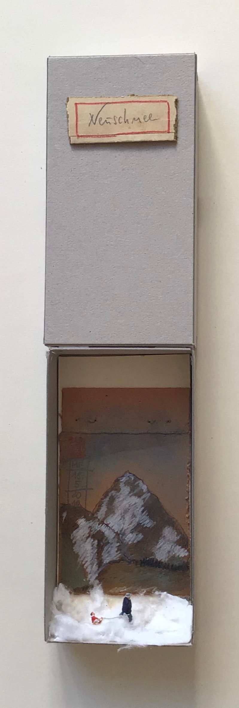 ZEICHNUNG/OBJEKT/KUNSTWERKSTÜCK, BLEISTIFT/FARBSTIFT AUF ALTEM BUCHDECKEL, 9 X 18 CM,, 2020, © MARTINA ETIENNE