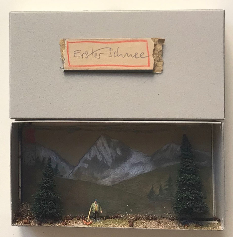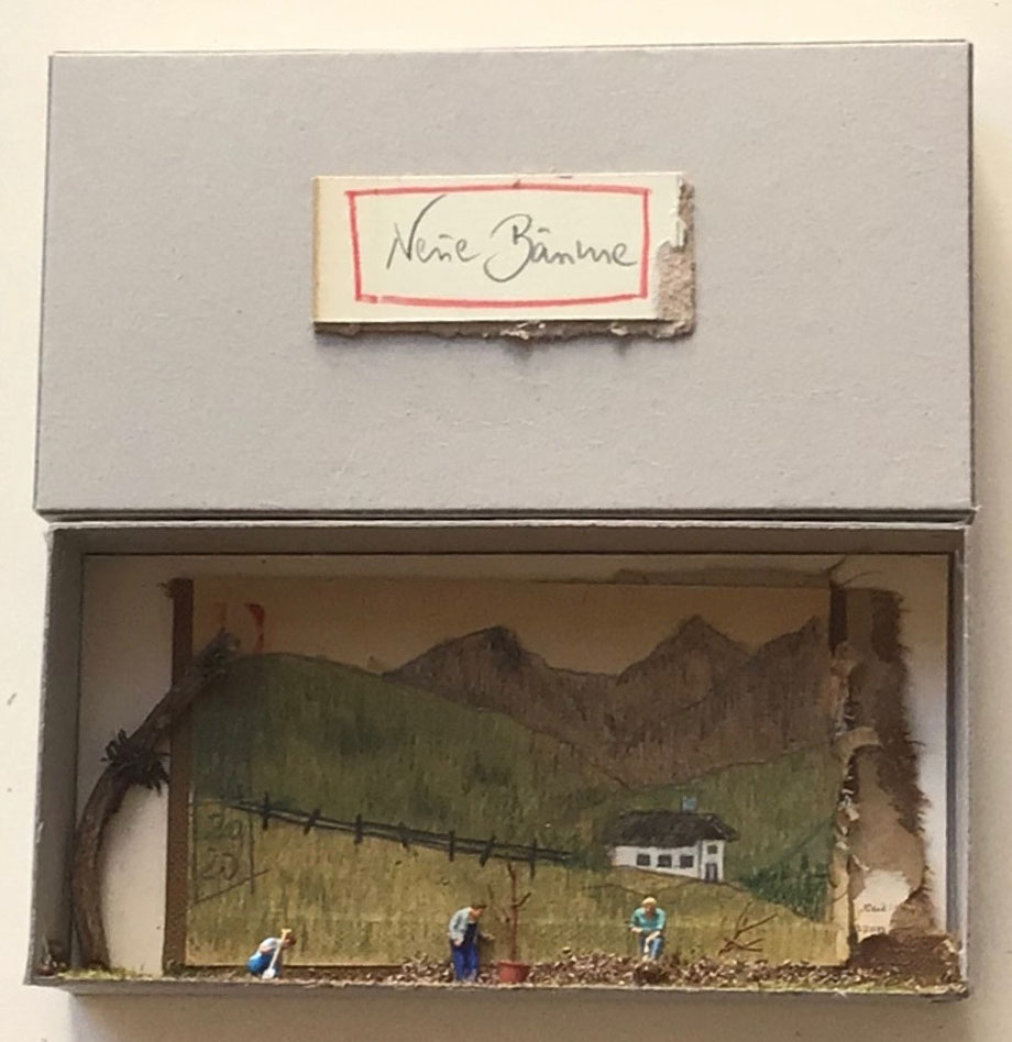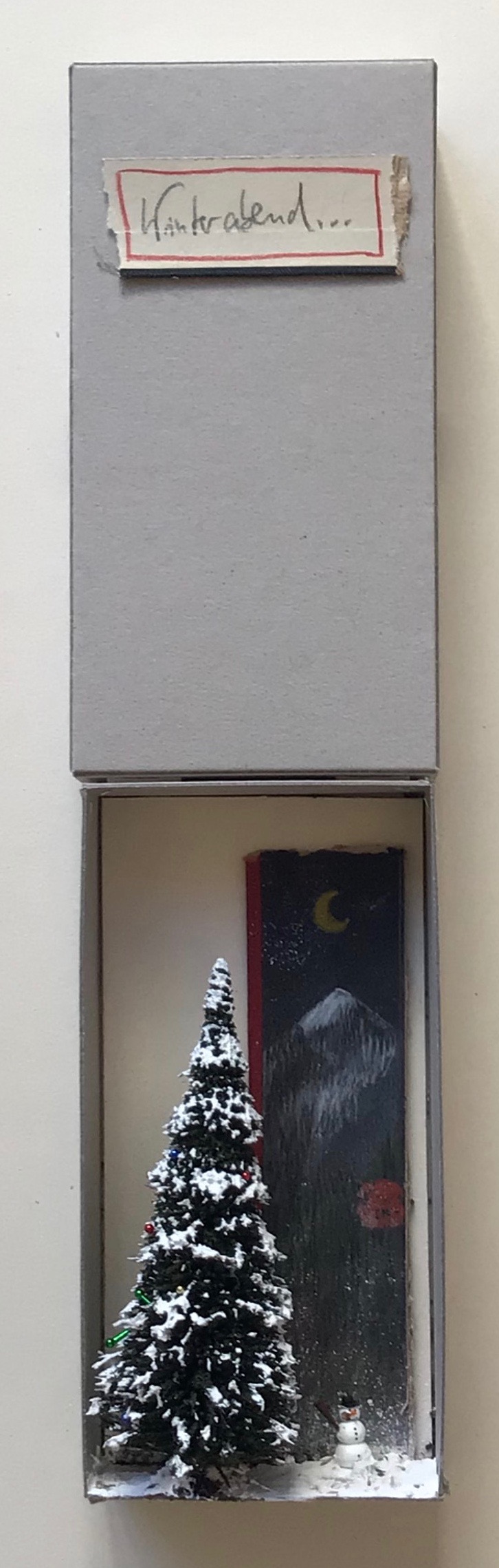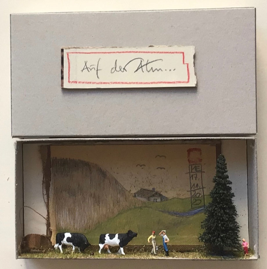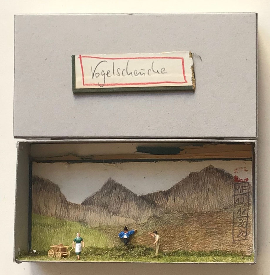 ZEICHNUNG/OBJEKT/KUNSTWERKSTÜCK, BLEISTIFT/FARBSTIFT AUF ALTEM BUCHDECKEL, 9 X 18 CM,, 2020, © MARTINA ETIENNE
