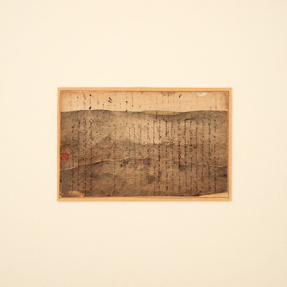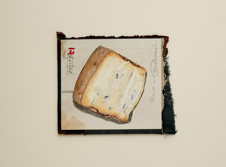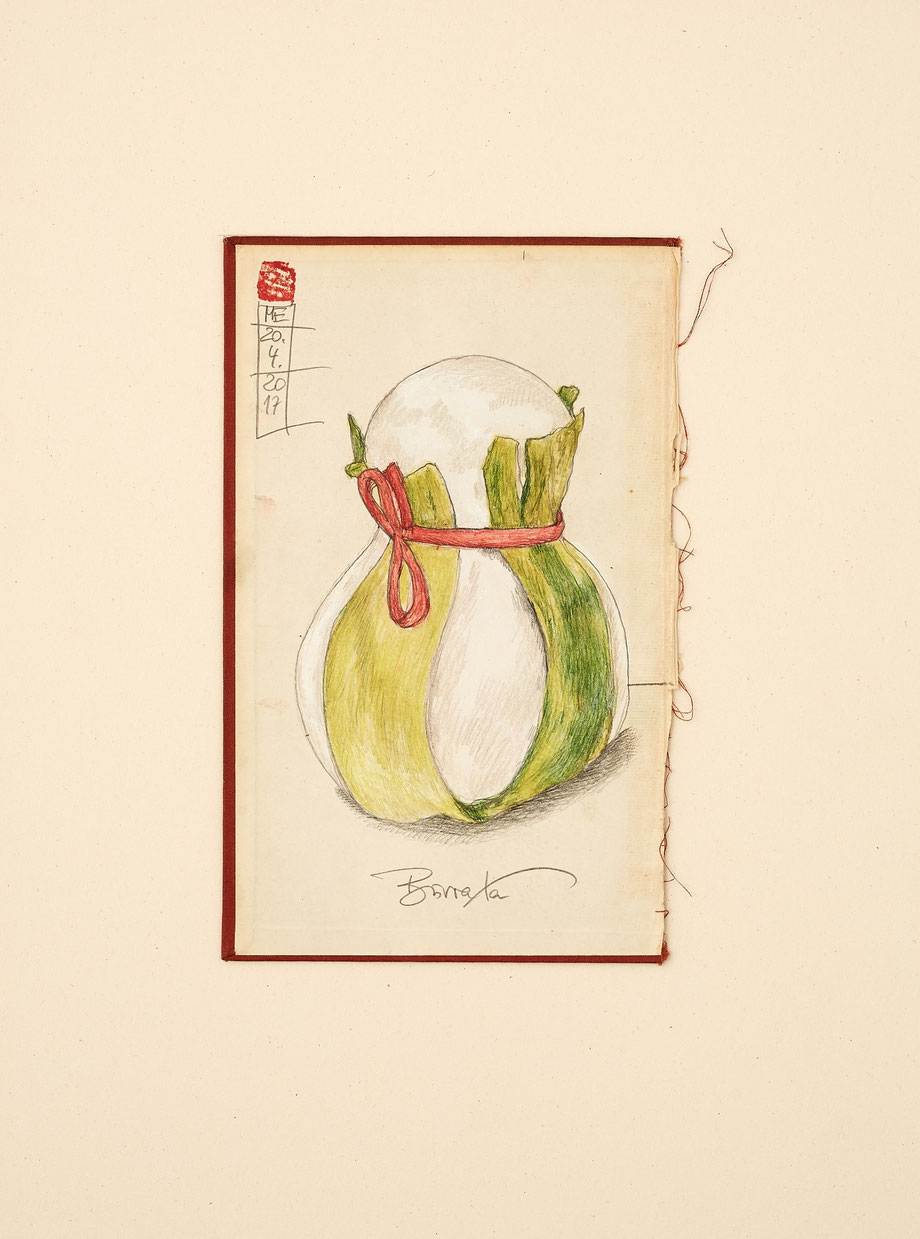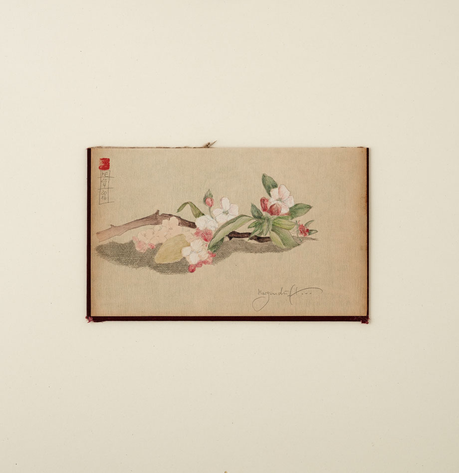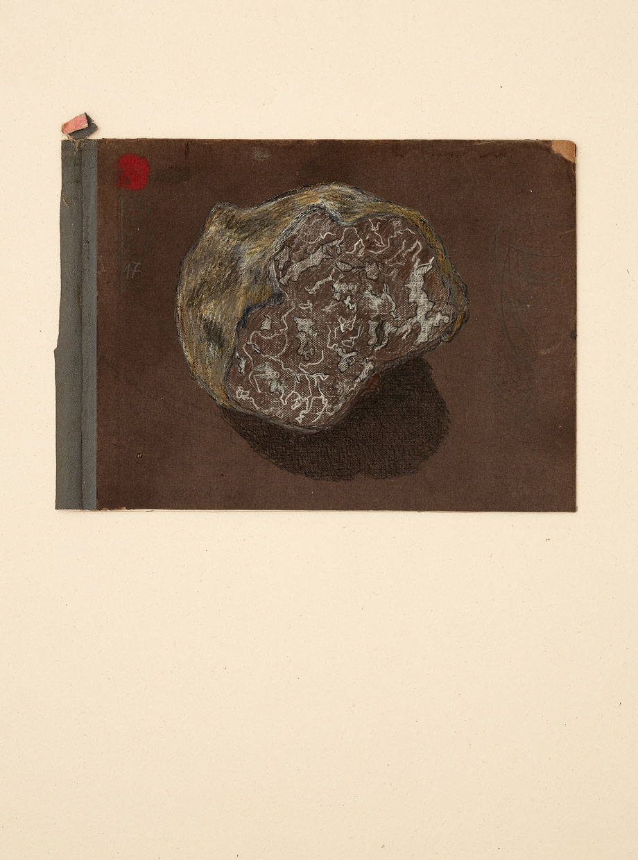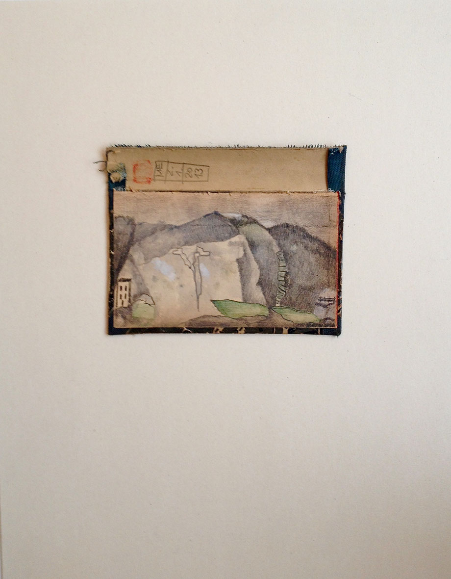 ZEICHNUNG/KUNSTWERKSTUECK, AUF ALTEM BUCHDECKEL, 24 X 18 CM, AUFGEZOGEN AUF FINNISCHE HOLTPAPPE, 2017, © MARTINA ETIENNE